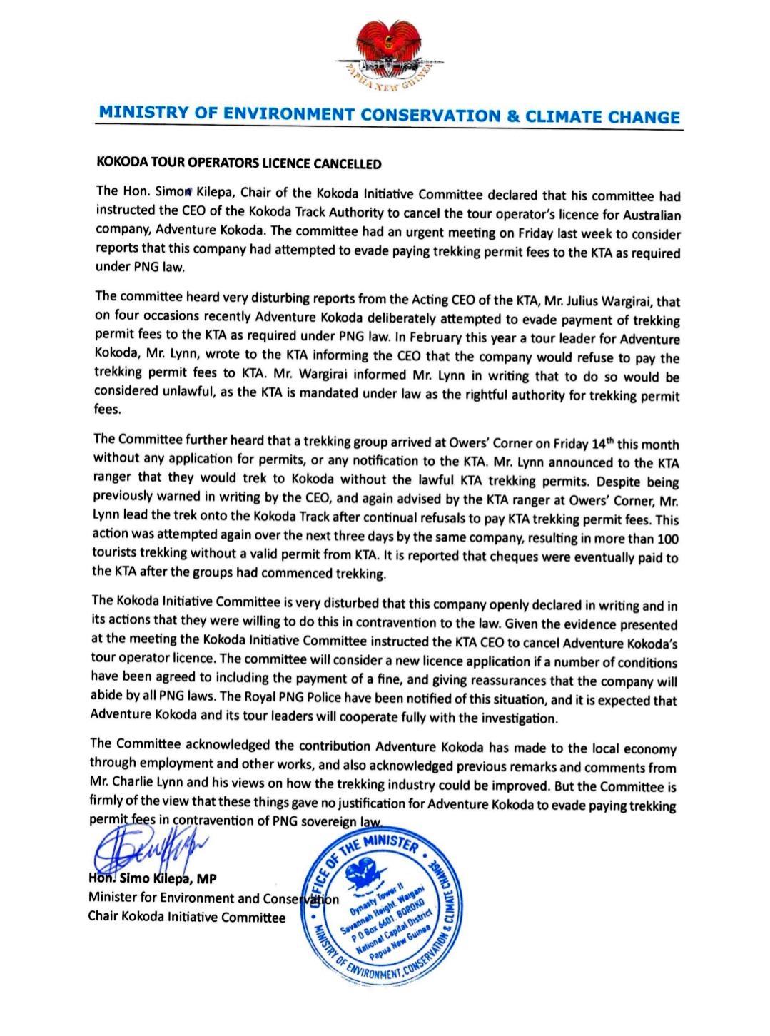 Below is copy of the letter cancelling the licence of Adventure Kokoda.